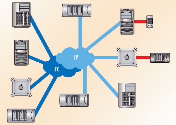 Несмотря на высокую производительность дисковых массивов прямого подключения DAS, их назначение — служить подручным хранилищем данных при рабочей станции видеомонтажа. Для создания управляемой среды коллективного доступа стоит применять только сетевые решения и устройства класса NAS (Network Attached Storage) или SAN (Storage Area Network). Производительную работу с большими объемами данных гарантируют сети SAN. Они предназначены для подключения внешних устройств хранения к серверам и рабочим станциям. Традиционно строятся на Fiber Channel, обеспечивают высокую производительность и надежность работы с хранилищем, при этом отлично масштабируются. Недостаток этого способа — довольно высокие начальные инвестиции и требования к квалификации обслуживающего персонала. Зато в дальнейшем такие сети требуют сравнительно невысоких затрат на поддержку и расширение емкости. Применение специализированного ПО или оборудования для SAN позволяет выполнять виртуализацию хранилищ.
