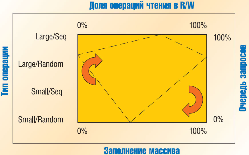Производительность СХД зависит от множества факторов, при этом далеко не все из них определяются физическими параметрами устройств хранения. Помимо характеристик компонентов дисковых массивов, на производительность влияют: тип доступа/характер данных (большие/малые блоки, последовательный/случайный доступ), соотношение операций чтения/записи (R/W), задержка доступа (длина очереди запросов), степень заполнения массива (см. схему «Факторы производительности СХД»). Считывание больших блоков происходит быстрее, чем малых, а последовательные операции совершаются быстрее случайного доступа. Аналогичная ситуация — с соотношением чтения и записи: увеличение доли запросов на запись приводит к снижению производительности.