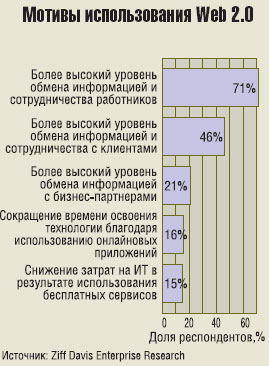 Конечно, многие приложения для Web 2.0 являются бесплатными. Но в ходе проведенного по заказу eWeek опроса только 15% респондентов указали на «снижение затрат на ИТ за счет использования открытых приложений» как на одну из двух главных причин использования Web 2.0.