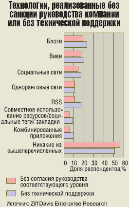 По данным нашего исследования, если приложение для Web 2.0 используется без технической поддержки, обычно это результат самовольного решения того или иного сотрудника. Когда мы задали вопрос, каким образом такие приложения устанавливаются в отсутствие сопровождения со стороны ИТ-службы, 64% респондентов ответили, что это происходит по инициативе отдельных работников; 51% заявили, что менеджеры среднего звена рекомендовали сотрудникам развернуть эти приложения, а 32% сказали, что в роли инициатора выступало высшее руководство.