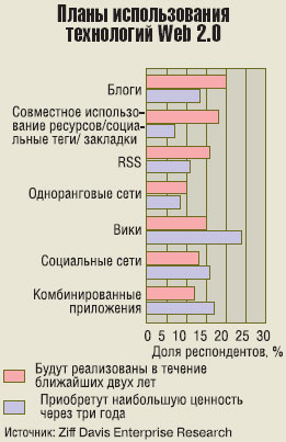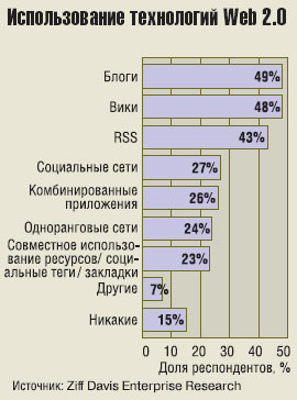 Предприятия пока нЕ слишком активно осваивают технологии Web 2.0, поскольку еще не решены вопросы, связанные с их самовольным использованием и безопасностью. В эксклюзивном исследовании, проведенном службой Ziff Da­vis En­ter­prise Re­search по заказу еженедельника eWeek, было опрошено 272 ИТ-специалиста. Вопросы касались применения в их компаниях технологий Web 2.0 и планов на этот счет.