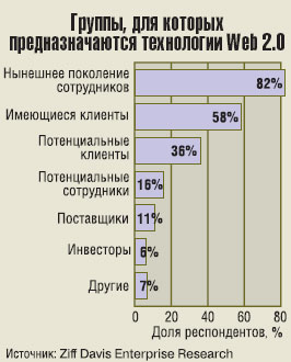 Когда респондентов спросили, для каких групп пользователей предназначены технологии Web 2.0, 82% ответили, что это работающие в данное время сотрудники. Кроме того, на просьбу выделить два основных мотива перехода к Web 2.0 в их компаниях, 71% респондентов заявили, что это совершенствование обмена информацией и взаимодействия между работниками, а 46% назвали совершенствование обмена информацией и сотрудничества с клиентами.