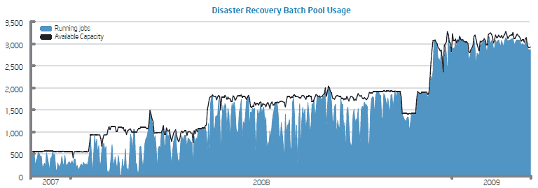 Число выполняемых пакетных заданий и имеющиеся для этого ресурсы. Intel удалось добиться почти 100-процентного использования серверов DR-центра (источник: Intel)