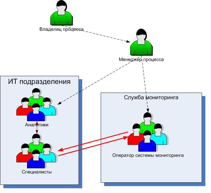 В рамках процесса мониторинга организовывается совместная работа сотрудников и руководителей ИТ-подразделений. Каждый из участников процесса обладает своим набором полномочий и обязанностей, т.е. играет свою роль в процессе. Пример возможной ролевой структуры процесса приведен на рисунке: