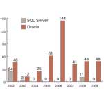 Существует стереотип, что продукты Microsoft менее безопасны. Однако Microsoft SQL Server если и критиковали за те или иные огрехи, связанные с уязвимостями или наличием явных прорех в защите, то на очень ранней стадии развития. Сейчас явных «дыр» или потенциальных лазеек для возможных злоумышленников больше у конкурентов (см. рис.). Хотя, естественно, к данным цифрам стоит подходить с большой осторожностью. Область безопасности бизнес-приложений довольно плохо изучена, и объектом пристального внимания соответствующих специалистов она становится только сейчас.