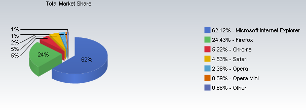 Аналитическая компания Net Applications выпустила свой отчет о рыночной доле браузеров в январе 2010. В отчете отмечено, что Internet Explorer 8 стал самым популярным в мире браузером с долей рынка 25,6%. В целом доля IE различных версий составляет 62,12%. На втором месте находится Firefox с 24,43%, тройку лидеров замыкает Chrome. Четвертое и пятое место занимают Safari и Opera с долями 4,53% и 2,38% соответственно.