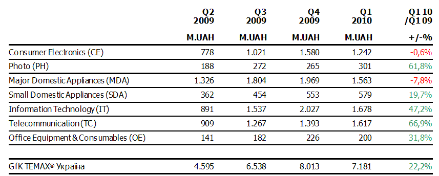 Сектор телекоммуникационного оборудования в первом квартале 2010 выделился наилучшей активностью среди всех секторов, которые попадают под мониторинг проекта TEMAX. В противоположность 2009, когда сектор телекоммуникаций развивался подобно рынку электроники, в первом квартале зафиксирован настоящий прорыв — продажи в секторе достигли отметки почти 67%. Этот рост стал возможным благодаря двум основным группам — мобильным телефонам и смартфонам, прирост каких достиг соответственно 54% и 332%. Эти две продуктовые группы суммарно охватывают 97% продаж сектора и, соответственно, определяют его динамику. В итоге видим, что при условиях соответствующей экономической стабильности потребители отдают свое преимущество модернизованным мобильным устройствам. На протяжении 2010 рост смартфонов замедлится, но очевидно и то, что это наиболее перспективная группа на всем рынке.