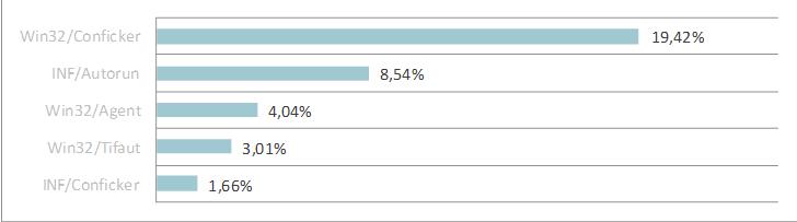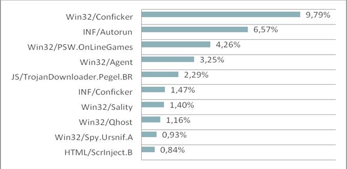 В июне семейство Conficker продолжает оставаться активным. Win32/Conficker который месяц удерживает пальму первенства среди вредоносного ПО в мировом (9,79 %) и украинском (19,42 %)рейтингах угроз. Этот сетевой червь распространяется при помощи уязвимости ОС Windows, которая находится в подсистеме вызова удаленных процедур (RPC), а также через незащищенные общедоступные папки и съемные носители информации. Также широкораспространенной остается угроза INF/Conficker — еще один представитель известного семейства. Используя файл autorun.inf, эта вредоносная программа распространяет последние вариации червя Conficker для заражения ПК. Большое количество зараженных компьютеров по всему миру и в Украине в том числе (1,47 % и 1,66 % соответственно) обеспечивает данной угрозе лидирущие позиции в рейтингах вредоносного ПО.