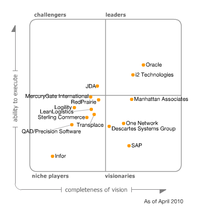 Аналитическая компания Gartner, Inc. расположила корпорацию Oracle в сегменте лидеров «Магического квадранта» в двух недавно опубликованных отчетах – «Magic Quadrant for Transportation Management Systems (TMS)» («Магический квадрант поставщиков систем управления транспортными перевозками»)[1] и «Market Share: Supply Chain Management, Worldwide, 2009» («Рыночная доля поставщиков на мировом рынке программного обеспечения для управления цепочками поставок в 2009 году»)[2].