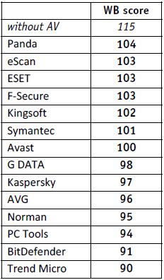 По итогам тестирования в пятерку лидеров вошли продукты Panda (104 балла), eScan (103 балла), ESET и F‐Secure (по 103 балла), Kingsoft (102 балла). На последнем месте оказались BitDefender и Trend Micro (91 и 90 баллов соответсвенно).