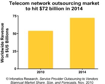 К концу 2010 г. объем мирового рынка услуг аутсорсинга для телекоммуникационных компаний достигнет примерно $53,5 млрд (доход производителей оборудования от задач по обеспечению эксплуатации сетей), что на 8% больше, чем в 2009 г.
