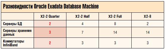 В киевском демоцентре находится Exadata в конфигурации Х2-2 High Performance Quarter Rack. В соответствии с принятой в Oracle новой семантикой названий это означает, что речь идет о системе второго поколения на базе х86-серверов (Х2) на двухъядерных процессорах (Х2-2) с высокопроизводительными SAS-дисками (High Performance, другой вариант – High Capacity). При этом два сервера БД, три сервера хранения данных и два коммутатора InfiniBand занимают четверть пространства шкафа (Quarter Rack). Как видно из таблицы, Oracle Exadata хорошо масштабируется, предусматривает резервирование компонентов и допускает объединение до восьми шкафов.