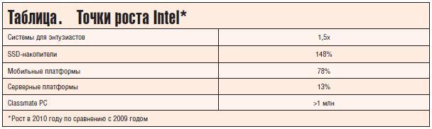 Конференция в Барселоне открылась очень позитивно, и причиной тому не только великолепная погода и мягкий средиземноморский климат Каталонии. Intel объявила о впечатляющем росте продаж сразу по целому ряду направлений (см. табл. 2), и хотя сравнение идет с кризисным 2009 годом, цифры все равно выглядят впечатляюще. Безусловно, во многом это заслуга партнеров, но и сам рынок меняется в выгодном для Intel направлении. Чего только стоит наблюдающийся в последнее время взрывной рост популярности смартфонов и планшетов, который неизбежно влечет за собой необходимость наращивания инфраструктурных вычислительных мощностей на стороне провайдеров интернета и операторов связи. Грег Пирсон (Greg Pearson), вице-президент Intel и генеральный директор подразделения World Wide Sales & Operations Group, приводит цифры, в которые трудно поверить. Всего за один день человечество на Земном шаре просматривает 9 млрд страниц в Facebook, 28 млн русскоязычных страниц в сети «В Контакте», почти 500 млн видеороликов и совершает 23 млн звонков в Skype. А ведь перечислены лишь несколько самых популярных сервисов и то без учета создаваемого контента. Надо ли говорить, какие вычислительные мощности необходимы для обслуживания этого невероятного количества запросов.