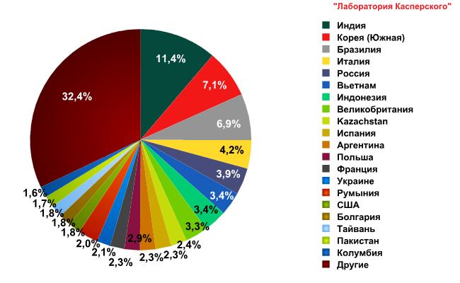 В мае лидером среди стран — источников спама — снова стала Индия, сообщает «Лаборатория Касперского». С территории этой страны было распространено 11,35% всей мусорной почты. Украина в рейтинге опустилась на две позиции по сравнению с апрелем, заняв 14 место с долей спама 3,4%.