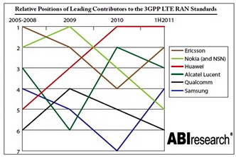 Huawei, Ericsson и Nokia Siemens Networks продолжают доминировать в отрасли LTE с точки зрения собственности основных стандартов и патентов LTE и рыночных долей. В период с 2010 года Huawei внесла наибольшее число стандартов и патентов LTE, продемонстрировав мощные возможности НИОКР. По общему числу стандартов и патентов LTE с 2005 по 2011 год лидирует компания Ericsson, доля Nokia (включая Nokia Siemens Networks) в этот период неуклонно снижалась.
