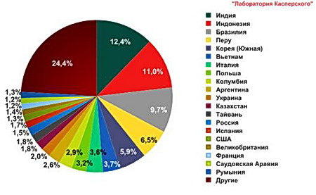 Неизменным осталось и лидерство Индии среди стран-рапространителей спама. Однако позиции других государств, входящих в первую десятку, претерпели значительные изменения. Верхние строчки заняли страны, доля которых в распостранении мирового почтового мусора по сравнению с ноябрем увеличилась более чем на 3%: Индонезия (+3,55%), Бразилия (+3,5%) и Перу (+3,5%). Одновременно вклад Южной Кореи, занимавшей в ноябре второе место, уменьшился на 2,85%, что привело к тому, что эта страна оказалась на пятой позиции. Доля остальных участников рейтинга изменилась незначительно - в пределах 1%. В свою очередь, Россия поднялась на одну ступень вверх и оказалась на 14-й строчке.