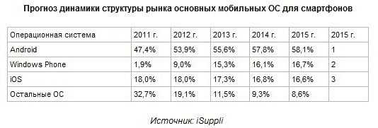 Согласно прогнозам аналитической фирмы IHS iSuppli, на мировом рынке ОС для мобильных устройств грядут перемены: к 2015 г. Windows Phone имеет все шансы стать ОС номер 2 в сегменте смартфонов, оставив позади себя даже Apple iOS. Однако лидерство в 2015 г. все равно останется за Google Android.