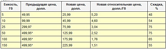 В таблице приведено сравнение скидок в зависимости от «облачного» роста и увеличения размеров баз данных.
