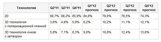 Согласно данным отчета, пока доминирующей остается технология очков с затвором, с уровнем проникновения в 2011 г. (относительно всех поставок LCD TV) в 6,2%, в то время как у технологии с поляризационной пленкой (film-type patterned retarder, FPR) — всего 3,9% (см. таблицу). По прогнозу NPD DisplaySearch, в 2012 г. уровни проникновения технологий составят 11,6% и 10,0% соответственно.
