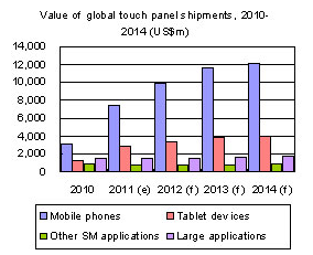 Исследовательское подразделение ресурса Digitimes опубликовало данные по мировому рынку сенсорных панелей и прогноз его дальнейшего развития. Отмечается, что это был один из немногих секторов ИТ-рынка, который в 2011 г. чувствовал себя хорошо и бурно развивался: в деньгах относительно 2010 г. он вырос на 88%, до уровня 12.56 млрд долл. Ожидается, что в текущем году рост этого рынка составит 25%, а затем вплоть до 2014 г. темпы роста замедлятся. Возможно, частично это будет связано с активным выходом на рынок других дисплейных технологий, в частности — OLED.