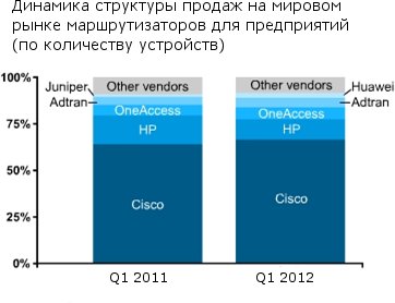 Неувядаемый лидер рынка — компания Cisco Systems — в этих реалиях в 1 кв. 2012 г. еще немного увеличила свою долю рынка — до 74,7%, поставив свой годовой рекорд. По объему продаж в единицах устройств первая пятерка мирового рынка в