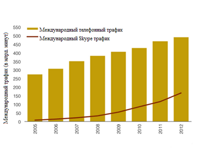 Сравнительная динамика роста трафика традиционной телефонии и Skype