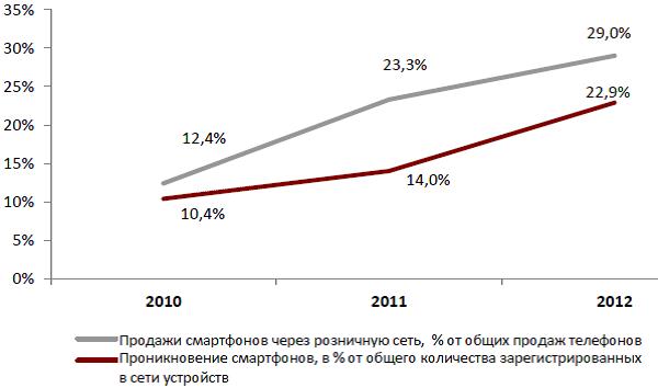 Продажи и проникновение смартфонов, 2010 – 2012 гг