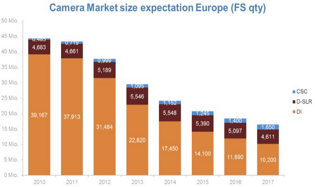 По словам Джона Брука, смартфоны и камерофоны продолжают оказывать сильное давление на рынок фотоаппаратов. Более всего это влияние заметно в сегменте компактных камер, спрос на которые с каждым годом снижается на 15-30%. Рынок зеркальных камер пока что на подъеме, тем не менее, после 2014 года, по прогнозам экспертов, там тоже начнется спад. Наиболее уверенно себя чувствует сегмент беззеркальных фотоаппаратов (известных как compact system camera —CSC, или mirrorless system camera — MSC), который будет расти ежегодно на 5-12%. В целом эксперты ожидают существенного сокращения рынка фотоаппаратов: с 45 млн штук в 2010 году до 16 млн в 2017.
