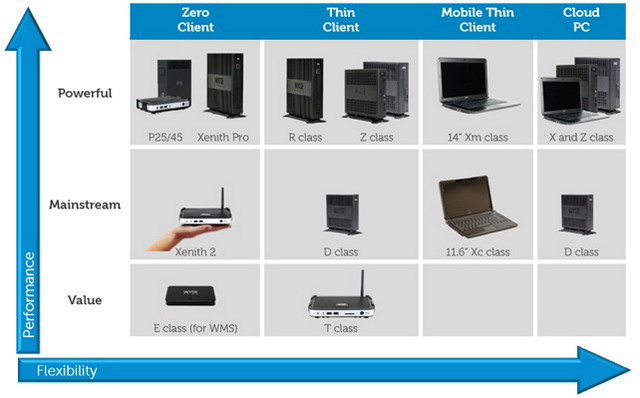 В портфель продуктов Dell в этой сфере входят настольные, мобильные, высокопроизводительные клиенты с предустановленной ОС Windows Embedded, Linux, Wyse ThinOS, различные нулевые клиенты для виртуализации Citrix, Vmware и Microsoft, а также бездисковые, высоко-производительные облачные клиенты, защищённые от внешнего воздействия. Такие решения позволяет запускать пулы клиентов с единого корпоративного образа системы.