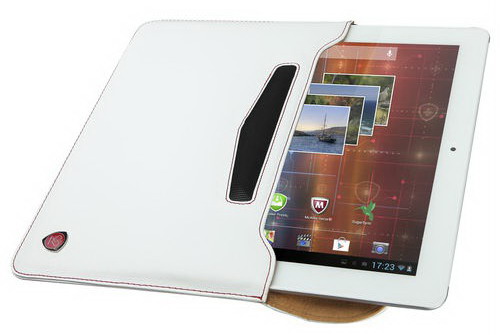 В комплекте есть чехол из прессованной кожи, напоминающий по формату «папку для бумаг». В целом он хорош для хранения и транспортировки, но не очень удобен для ежедневной эксплуатации. Более оптимален был бы чехол типа smart-cover, который можно использовать в качестве подставки для планшета в вертикальной позиции. Такой чехол имеет еще одно преимущество – он позволяет отразить звук с расположенных сзади динамиков и тем самым усилить его.