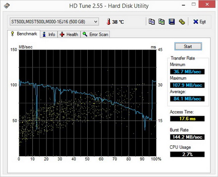 Индекс производительности Windows в версии 8.1, как известно, отсутствует. В Microsoft посчитали, что он не совсем объективен. Утилита HD Tune показала среднюю скорость передачи данных 84 МБ/с, время доступа 17,5 мс, что, в общем, вполне ожидаемо. Производительность в программах PCMark Vantage составила 3520 очков, в PCMark 7 - 2096 очков.