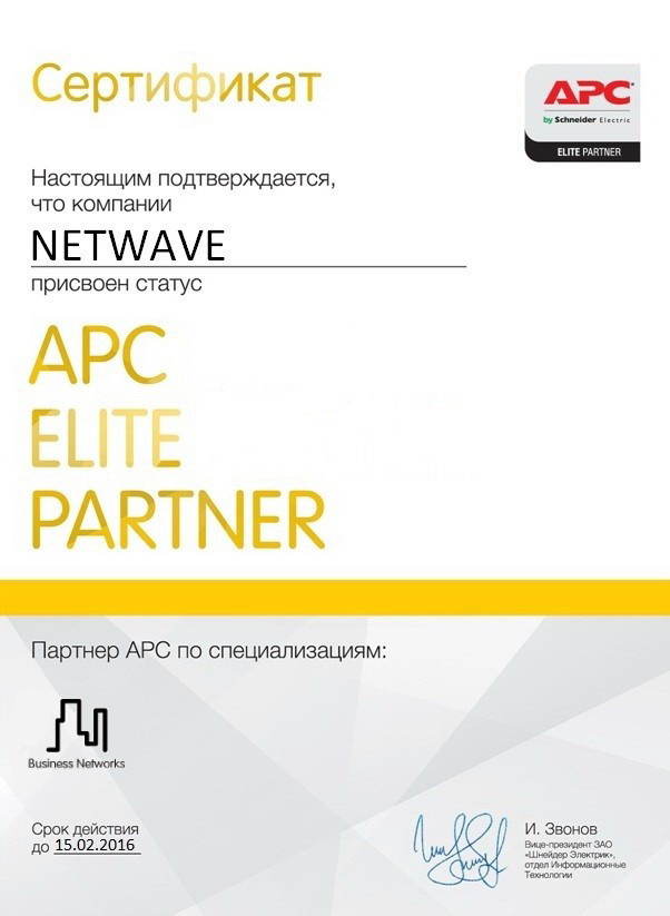 Получение статуса АРС Elite Business Network Partner свидетельствует о высокой компетенции специалистов компании NETWAVE в области внедрения решений APC by SE на базе архитектуры InfraStruxure, которая включает построение инженерной инфраструктуры коммутационных узлов серверных комнат. Также инженеры компании обладают профессиональными знаниями и опытом в решении широкого спектра задач по мониторингу и управлению инженерной инфраструктурой.