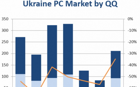 Так, согласно ежеквартальному отчету IDC PC Tracker за период с июля по сентябрь в Украину было поставлено 211 тыс. ПК, что на 34,5% ниже показателей аналогичного периода прошлого года. Из них на настольные системы пришлось 93 тыс. устройств (падение 1,5%), а ноутбуки просели на 48,2%, до 119 тыс.
