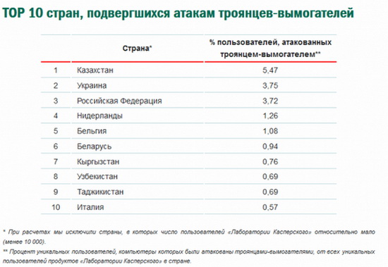2015 год стал годом стремительного развития программ-вымогателей. По данным Kaspersky Lab, за последние 12 месяцев число пользователей, атакованных подобными зловредами, выросло в 1,7 раза. При этом Украина оказалась второй в списке стран, наиболее подверженных риску столкновения с этой угрозой, уступая по данному показателю только Казахстану.