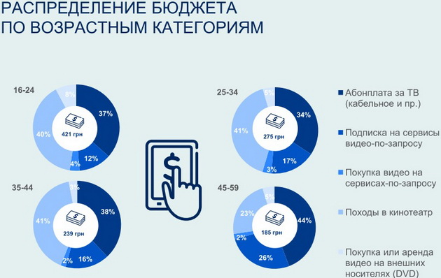 В настоящее время украинские пользователи уделяют просмотру ТВ и видео контента 38 часов в неделю, более шести часов из которых приходятся на фильмы, сериалы и программы, демонстрируемые на эфирных каналах. При этом, привычки телесмотрения у разных возрастных групп могут существенно отличаться. Так, например, пользователи в возрасте 35-59 лет смотрят эфирные фильмы почти в два раза больше, чем пользователи в возрасте 16-34.