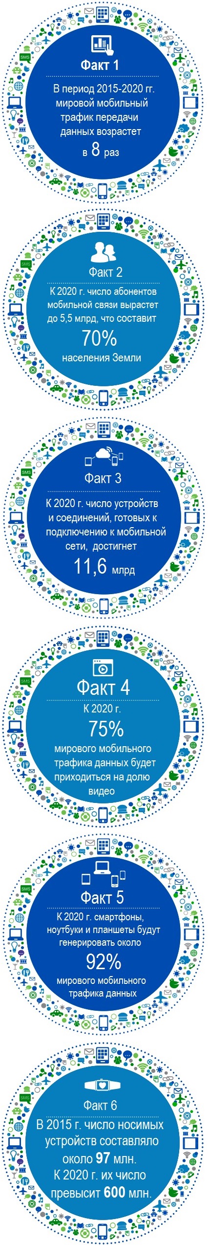 На днях, как уже сообщалось, вышел в свет 10-й по счету ежегодный отчет Cisco «Наглядный индекс развития сетевых технологий: глобальный прогноз по мобильному трафику на период 2015-2020 гг.»1. Он содержит шесть прогнозов развития мобильного трафика в ближайшие годы.