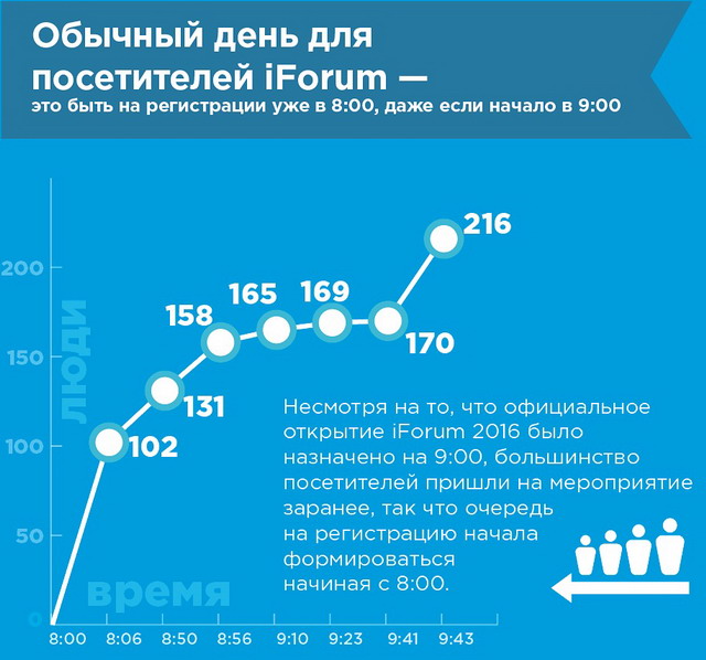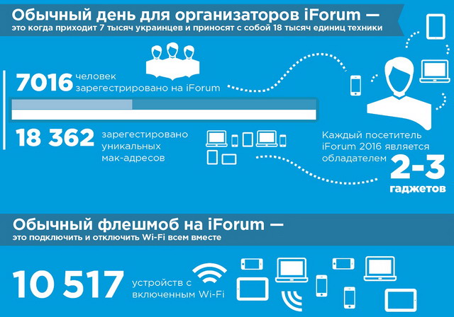 По данным стартапа Adtena (онлайн-платформы по работе с публичными Wi-Fi сетями), 7016 человек, которые пришли на форум, использовали порядка 18 362 устройств. Это значит, что каждый посетитель пользовался 2-3 гаджетами для подключения в Интернет (больше данных см. в инфографике от 1991 Инкубатор).