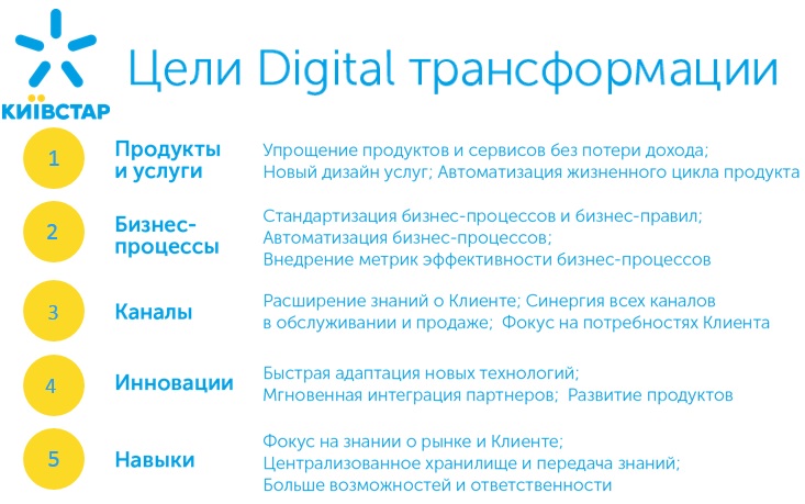 Трансформация подразумевает модернизацию технологической инфраструктуры, рационализацию процессов и снижение количества уровней управления для создания гибкой и легко адаптируемой организации. Трансформация полностью соответствует стратегии VimpelCom, материнской компании Киевстар, объявившей о трансформации Группы в августе 2015 года.