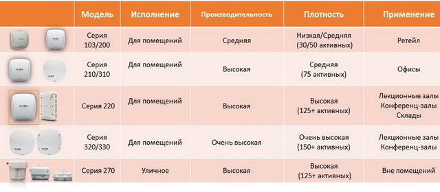 Портфель решений Aruba в сегменте беспроводных точек доступа включает как бюджетные решения 103-й серии (стандарт 802.11n), так и продвинутые двухдиапазонные устройства 320-й серии с поддержкой гигабитного WiFi стандарта 802.11ac. В зависимости от модели, решения HPE Aruba поддерживают встроенный межсетевой экран, интегрированный Wireless IPS, анализатор спектра, систему контроля и управления радиоэфиром, высокую производительность при высокой плотности (свыше 120 клиентов на точку).