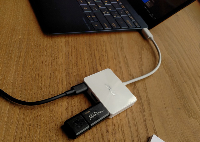 Новый ультрабук от ASUS оборудован всего одним портом USB-C, через который осуществляется зарядка батареи аппарата. Зато в комплекте поставки присутствует адаптер-хаб, который содержит на выходе порты USB 3.0, USB-C и HDMI. Через этот адаптер и порт USB-C можно осуществлять зарядку аккумулятора.