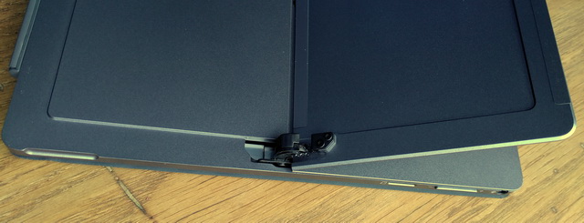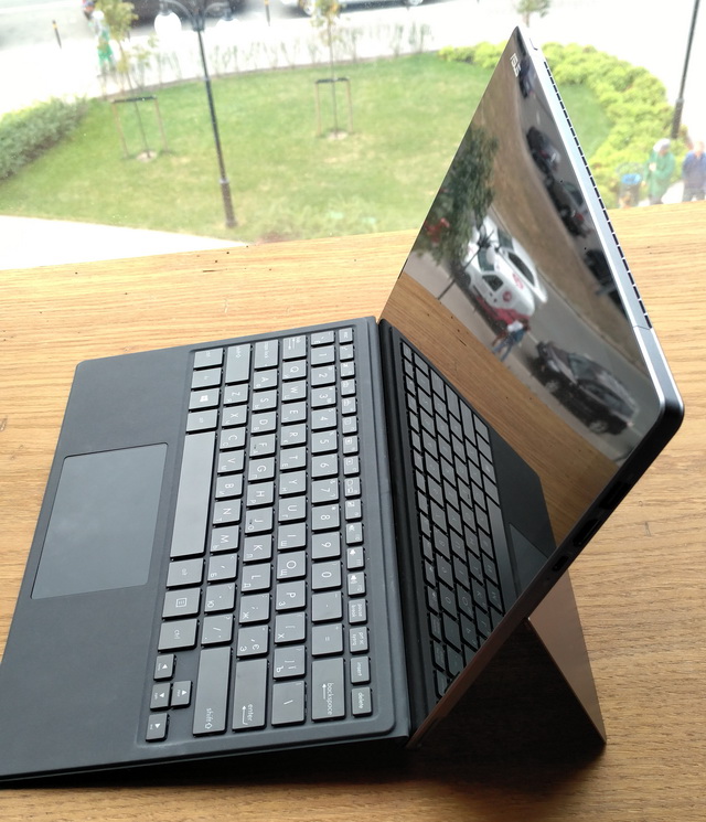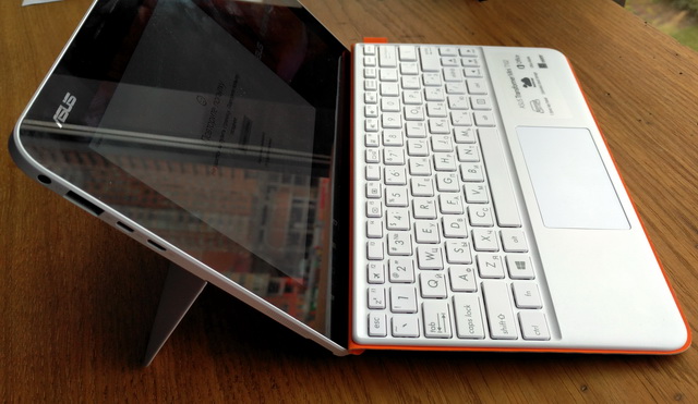 Подставка, смонтированная на задней панели, позволяет установить планшет под любым углом, вплоть до 170°. Акустическая система из двух громкоговорителей создана компанией Harman Kardon. Клавиатура полноразмерная, но без подсветки.