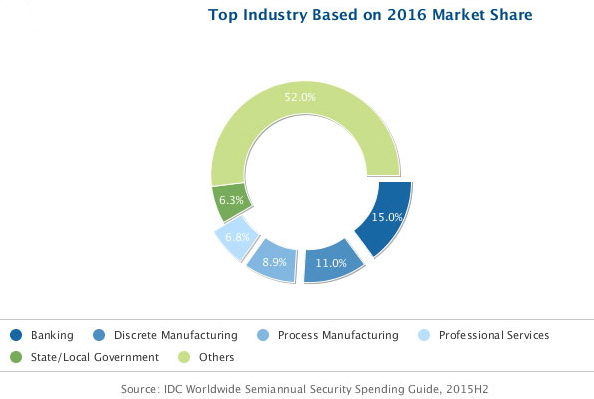 Почти 42% рынка ИБ-решений в 2016 году будет сосредоточено в четырех отраслях: банковский сектор (2,9 млрд. долл.), штучное производство, непрерывное производство и профессиональные услуги. Эти четыре сферы будут оставаться крупнейшими источниками расходов на технологии безопасности, продолжая расти быстрее, чем рынок в среднем. Но еще более быстрый рост инвестиций в безопасность будут демонстрировать сектор коммунальных услуг и здравоохранение, а также профессиональные услуги, — все они будут иметь CAGR более 9% в период до 2020 года.