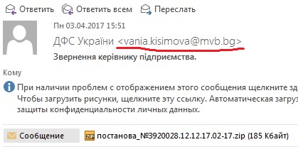 Как распознать фальшивку? Во-первых (и это самое главное), обращайте внимание на адрес отправителя: в данном случае письмо от ДФС пришло с совершенно левого адреса  "vania.kisimova@mvb.bg". На самом деле домен ДФС следующий: sfs.gov.ua.