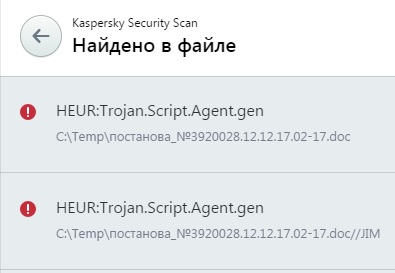 Пару недель назад многие СМИ, в том числе и сама Державна Фіскальна служба України (ДФС), писали о том, что злоумышленники рассылают фальшивые письма про "наявну заборгованість" от имени якобы ДФС. В письме предлагалось перейти по вложенной ссылке и скачать ZIP-архив, в котором находился вредоносный троян. Теперь киберпреступники изменили тактику: они вкладывают ZIP-архив прямо в письмо, распаковав который вы обнаруживаете на первый взгляд совершенно безобидный WORD-документ "постанова_№3920028.12.12.17.02-17.doc". Но более детальная проверка показывает, что в документе содержится вредоносный код HEUR:Trojan.Script.Agent.gen.