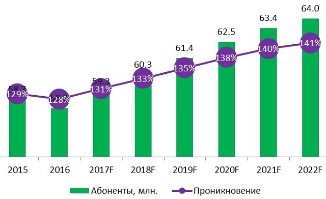 Количество мобильных подключений в Украине составляет 58,2 млн. Ожидается, что к 2022 году это количество возрастёт почти на 6 млн. Количество 3G-подключений составляет 26%.