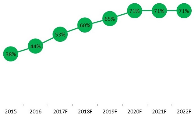 способности, но и необходимостью внедрения решений для автоматизации индустрий. 5G станет единой сетью для множества сценариев использования. К 2022 году ожидается более полумиллиарда абонентов 5G, не считая подключенных устройств Интернета вещей. Согласно прогнозам, 5G покроет около 15% мирового населения к тому