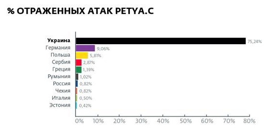 По данным системы телеметрии ESET, большинство атак шифратора Petya, отраженных антивирусными продуктами ESET на рабочих станциях, приходится на Украину, Германию и Польшу. Россия вошла в первую десятку атакуемых по итогам второго дня эпидемии.