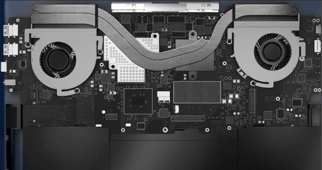 Система охлаждения с двумя отдельными вентиляторами и увеличенными медными трубками эффективно отводит тепло, что позволило снизить общую температуру на поверхности корпуса более чем на 2 градуса.