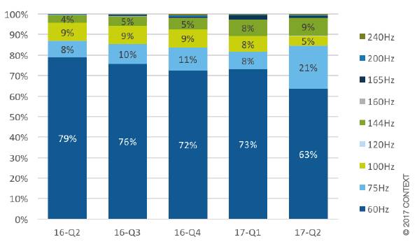 Изменение частоты обновления экрана геймерских настольных мониторов (доля мирового рынка по объему поставок). Источник: CONTEXT