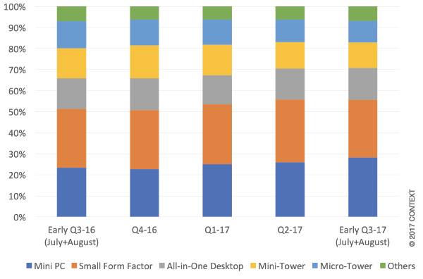 Объем продаж мини-ПК (в штуках) в июле и августе 2017 года вырос на 12% по сравнению с тем же периодом прошлого года, тогда как рынок десктопов в целом сократился на 8% за год. Как результат, доля мини-ПК в общем объеме продаж настольных компьютеров выросла на 5 процентных пунктов, с 23% в первые два месяца 3 квартала 2016 года до 28% в этом году, и данный подсегмент был самым быстро растущим на рынке.